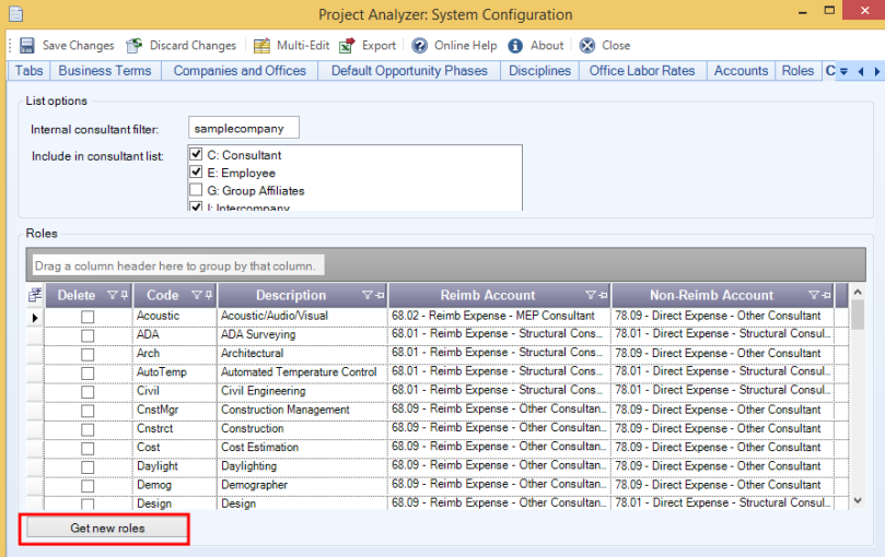 Perform the following steps to get additional consultant roles from the financial system for use in Project Analyzer.