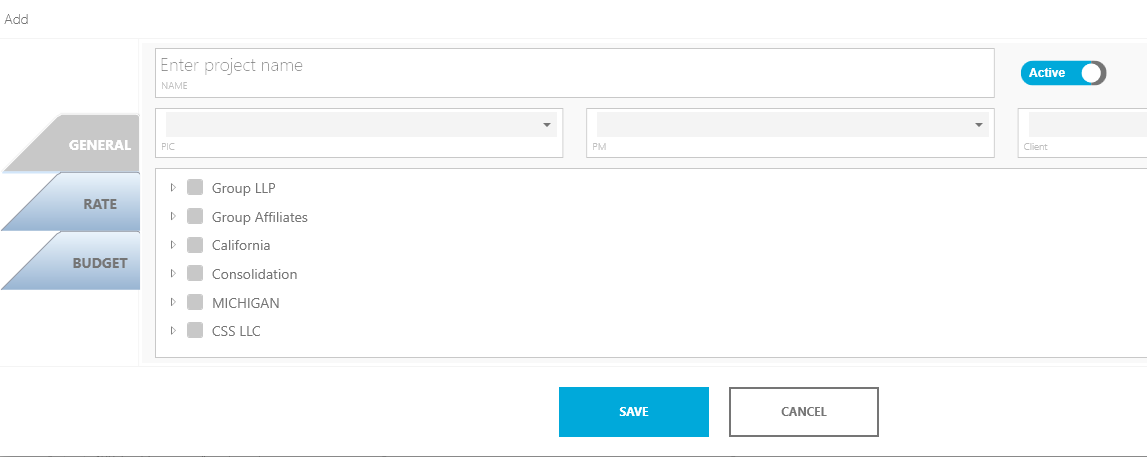 Note: This is the only mandatory field. You can save a project with only a name for the project. - Toggle if you want to make this project active.